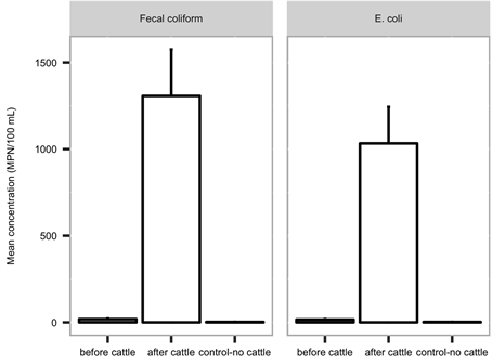 Figure 2. Mean fecal coliform (left graph) and Escherichia coli (right grahp) concentrations (MPN/100 mL) across 14 sites sampled between 2012 and 2016 within grazing areas on the Stanislaus National Forest, CA, just prior to cattle being released onto the forest (“before cattle”), after cattle were released onto the forest (“after cattle”), and also concentrations at the control site where no cattle are permitted during any time period (“control-no cattle”). Error bars denote standard error.
