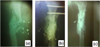 Figure 2. Femoral bone loss treated by the technique of induced membrane (a) Initial lésion (b) spacer (c) consolidation after graft.