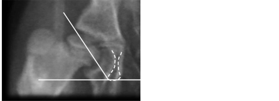 Figure 4. Acetabular angle of Sharp (AS) is measured with a line that unites the superior edge of the acetabulum with the inferior edge of the same forming an angle with the bi-isquiatic line (n: 42˚).