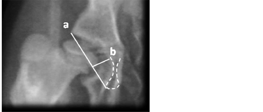 Figure 5. Acetabular depth index (ADI). Acetabulum Deepness is measured by drawing two vectors: the first one from the inferior- external edge until the superior-external of the acetabulum; the second is drawn a vector that is perpendicular to the anterior and that goes until the acetabular background marked by the line (ileopecten) of the iliop- ectineal eminence. It is calculated: p = (b/a) × 100% (n: 60%).