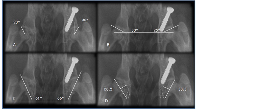 The following parameters were compared between groups: ADI [15] , CE angle of Wiberg, AS and Acetabular anteversion (AA) (Figure 6(a) and Figure 6(b)).