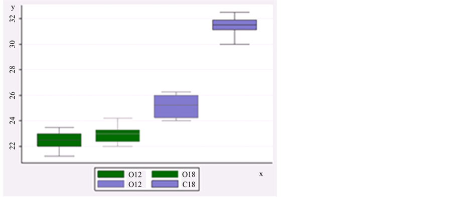 Figure 9. Comparisons of angle values between groups (n = 20) at weeks 12th (when the screws were removed) and 18th: it is clear that continued growth in the intervention group hips. O = intervened hips. C = hips not intervened. x: weeks; y: grades.