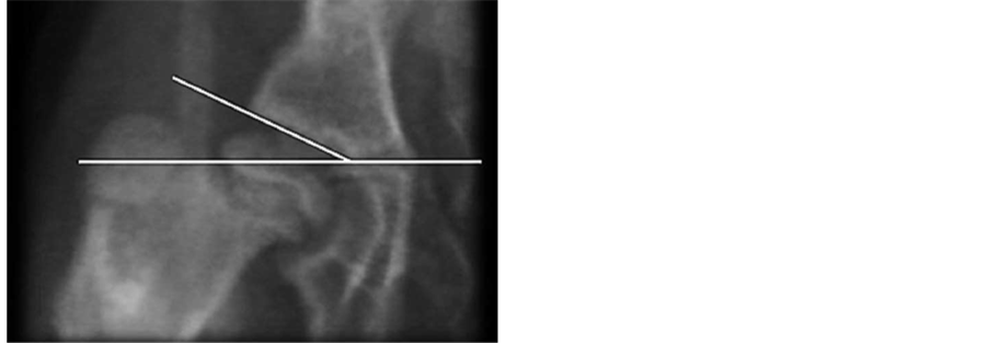 The following radiographic parameters were measured: Acetabular index (AI) [11] (Figure 2), lateral center- edge (CE) angle of Wiberg [12] (Figure 3), acetabular angle of Sharp (AS) [13] (Figure 4), and acetabular depth index (ADI) [14] (Figure 5).