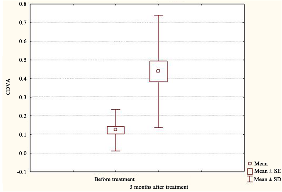 Table 4. Mean value of corrected distance visual acuity before and 3 months after treatment in analyzed group.