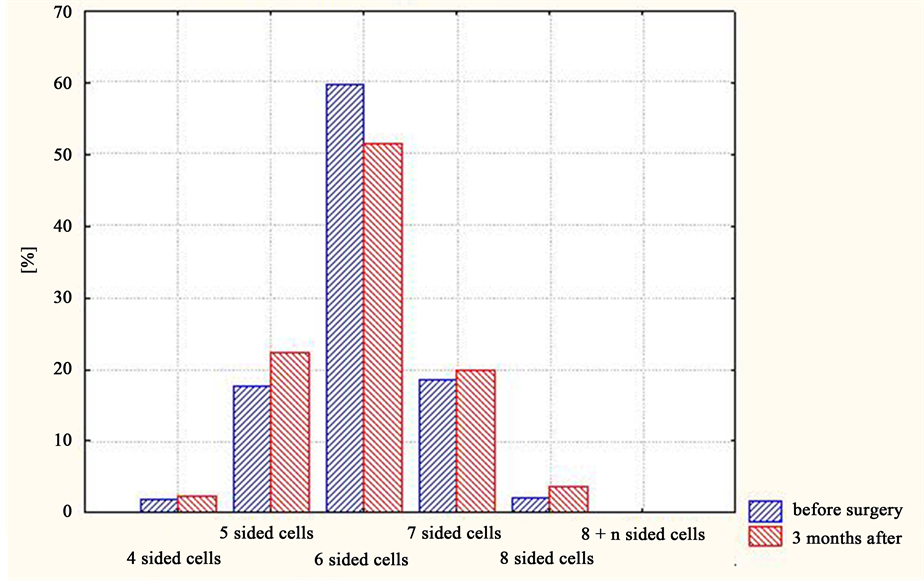 Three months following the surgery, the research group showed a statistically significant improvement in visual acuity, a statistically significant increase in the percentage of five and eight-sided cells, a statistically significant decrease in the percentage of six sided cells and a statistically significant decrease in corneal endothelial