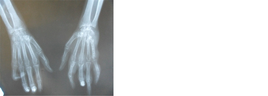 Figure 2. X-ray of two face’s hands and wrists giving prominence to a severe destructive gouty arthropathy and tophus.
