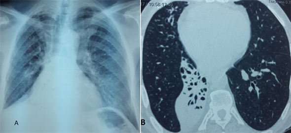 Figure 1. (A) chest radiograph showing right hemithorax retraction and tracheal retraction to the right side; (B) CT thoracic in parenchymatous window and axial cut showing a focus of parenchymatous condensation systemized lobar lower right, in which are lesions of dilations of the bronchi of the cylindrical type.