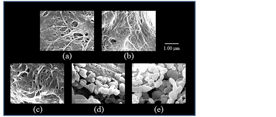 Figure 3 shows the SEM images of MNFs. As shown in Figure 3, chitosan nanofibers were seen when the concentration of MNPs was low. In contrast, globular aggregations like cocoons were observed when the concentration of MNPs was high.