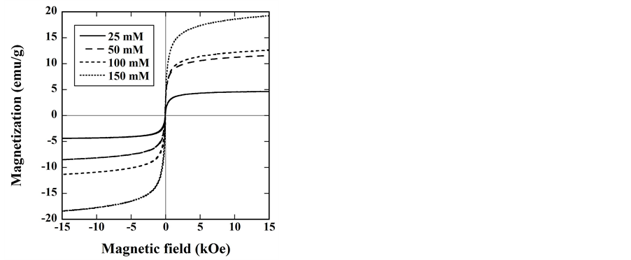 Figure 4. Magnetization of the MNFs with various concentrations of MNPs (25, 50, 100, and 150 mM Fe), measured using a vibrating sample magnetometer (VSM).
