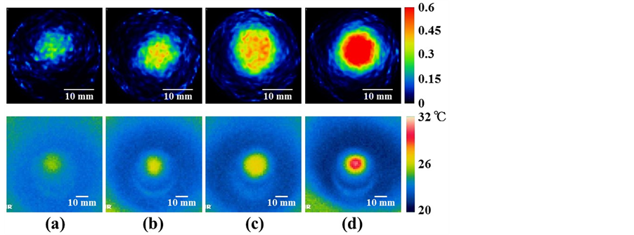 Figure 5. MPI images of the MNFs (10 mm in diameter and 2 mm in thickness) with various concentrations of MNPs (upper row) and the thermal images obtained by an infrared thermometer 10 min after the start of magnetic hyperthermia (lower row). (a) 25 mM Fe, (b) 50 mM Fe, (c) 100 mM Fe, and (d) 150 mM Fe. Scale bar = 10 mm.