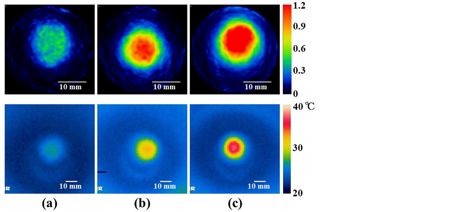 Figure 6. MPI images of the MNFs (10 mm in diameter and 2 mm in thickness) with various numbers of MNF sheets (upper row) and the thermal images obtained by an infrared thermometer 10 min after the start of magnetic hyperthermia (lower row). (a) one sheet, (b) two sheets, and (c) three sheets. In these cases, the concentration of MNPs was 100 mM Fe. Scale bar = 10 mm.