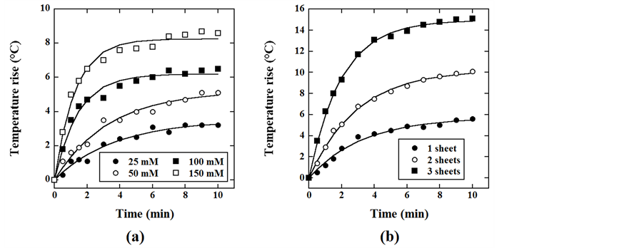 Figure 7 shows the time courses of the temperature rise in MNFs, which were measured by an infrared thermometer. Figure 7(a) shows the case when the concentration of MNPs was varied as 25 mM (closed circles), 50 mM (open circles), 100 mM (closed squares), and 150 mM (open squares), whereas Figure 7(b) shows the case when the number of MNF sheets was varied as one (closed circles), two (open circles), and three (closed squares).