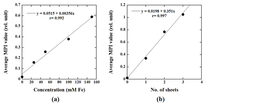 The correlations of the average MPI value with the concentration of MNPs and the number of MNF sheets were analyzed using linear regression analysis and the correlation coefficients and regression equations were calculated. The correlations of