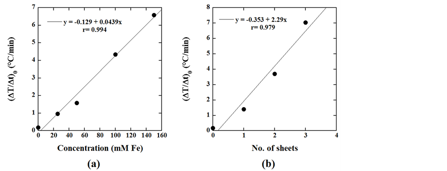 Figure 9. (a) Relationship between the concentration of MNPs and the initial slope of the time-dependent temperature rise ((ΔT/Δt)0) calculated from Equation (2). (b) Relationship between the number of MNF sheets and (ΔT/Δt)0 calculated from Equation (2).