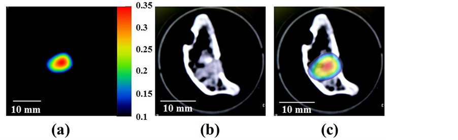 Figure 10. (a) MPI image of the MNFs (150 mM Fe) implanted in the bone of a chicken, (b) X-ray CT image of the bone implanted with MNFs, and (c) the fusion image between the MPI and X-ray CT images. Scale bar = 10 mm.