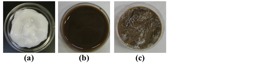 Figure 1. (a) Chitosan nanofibers cross-linked with glutaraldehyde vapor in a sealed vial for 24 hours, (b) magnetic nanofibers (MNFs) fabricated by mixing the cross-linked chitosan nanofibers with magnetic nanoparticles (MNPs), and (c) MNFs freeze-dried for 24 hours.