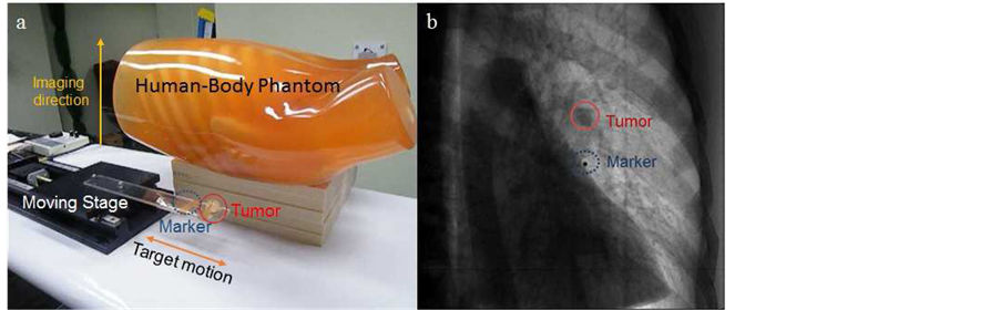 Respiratory motion management has been a major challenge in radiation therapy especially for lung cancer with the large amplitude of motion in lungs being clinically significant [1] . Confining the radiation to the target and reducing the unnecessary high dose to the healthy tissues still remain a major concern in modern radiation therapy. In the case of moving tumors, the possible reduction of the internal margin becomes absolutely essential. Various strategies have been introduced in order to compensate the tumor motion, beam gating, active or volunteer breath hold, beam tracking, tracking with fiducial or infrared markers etc. [2] . Long-term breath-hold technique lacks the patient comfort, and beam gating and beam tracking require precise knowledge of the position of the tumor [3] . Gating using infrared or implanted markers have been popular treatment lately where the tumor is irradiated during a certain location. However, there are some disadvantages: a long treatment time due to inefficiency, an uncertainty in the correlation between the target and the marker motion, and invasive procedure for implanted marker. On the other hand, the tumor tracking radiation therapy is currently in applicable phase by means of the development of the image-guidance system. A modern image-guided radiation therapy (IGRT) system has made it possible to monitor the target motion during the external radiation therapy treatment. Most treatment machines are nowadays equipped with one or two kV X-ray source with flat panel detectors with the rotating or fixed gantry [4] and sometimes a robotic treatment couch [5] for the precise radiation delivery. With such a system, the sight of the tumor location can be adjusted based on the real-time X-ray images.