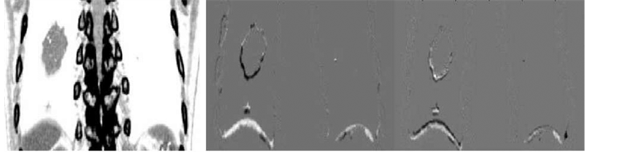 Once the coefficients are predicted, the predicted image can be reformed as an image by multiplying the pre- dicted coefficients and the principal component images. Principal component images are already obtained in Section 2.2.1 by arranging the eigen vectors to two dimensional martrices. The three principal component images in case of whole 4DCT images are illustrated in Figure 3.
