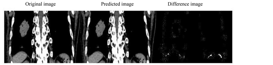Figure 4. Image prediction result for large view 4DCT image which shows the original (left), predicted (center) and the difference image (right).