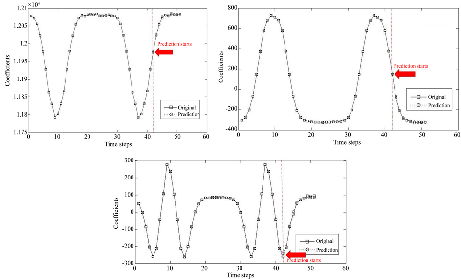 Figure 6. Result for the prediction of coefficient for the first principal component (left top), for the second principal component (right top), and for the third principal component (bottom centre).