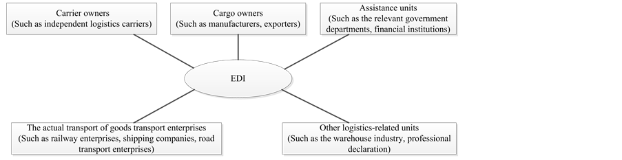 In recent years, in addition to a few areas such as foreign trade, customs where EDI technology is used comparatively successfully, other areas are still trying stage. The implementation of EDI in global is based on the common EDI use for all EDI participants, which is the only way to bring into play the advantages of EDI. If EDI technology is applied in few areas, one-stop service can not be achieved. In addition, the use of EDI in China’s enterprises is also due to the backwardness of the supporting sector EDI, not from the economic benefits, people on the EDI had doubts. Companies lose the confidence of the application of EDI, EDI application form a vicious cycle of the state. Figure 1 is an example of a logistics EDI system, which shows the specific issues when the owner of the shipments, logistics and transport owners and receiver owners use EDI in logistics management [4] .