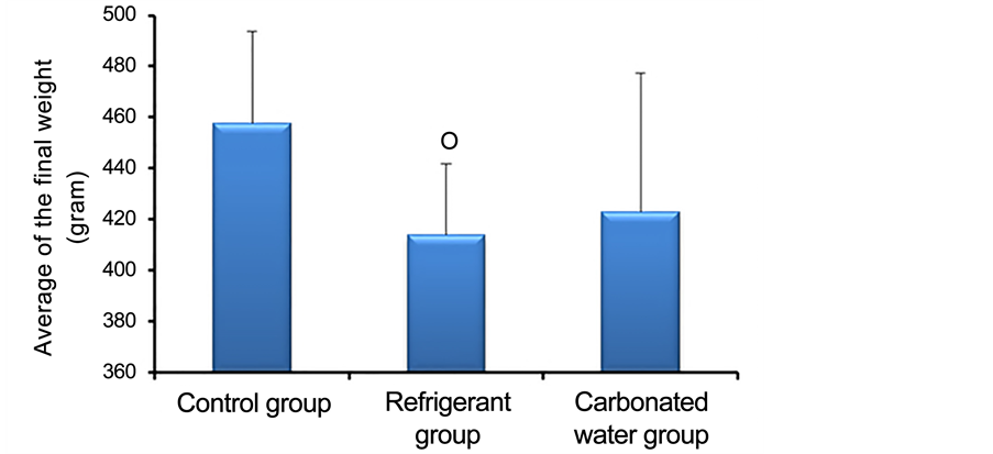 Figure 1. Average of the final weight of the control animals (n = 5) and of the groups treated with refrigerant (n = 5) and carbonated water (n = 5) during ninety days.○ P = 0.0105 for Control x Refrigerant.