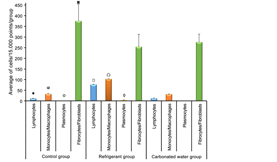 plasma cells 3 ± 1.58), fibrocytes/fibroblasts (254 ± 58.57)), i.e., an increase in inflammatory cells and the reduction of fibrocytes and fibroblasts were observed in the refrigerant treated group. It was also possible to identify a significant difference when comparing the lymphocytes, monocytes/macrophages and plasma cells of the group that consumed refrigerant to the group treated with carbonated water (lymphocytes (12 ± 1.30), monocytes/macrophages (31 ± 1.14) and plasma cells (0 ± 0)). The comparison of the other data of this figure did not present significant results.