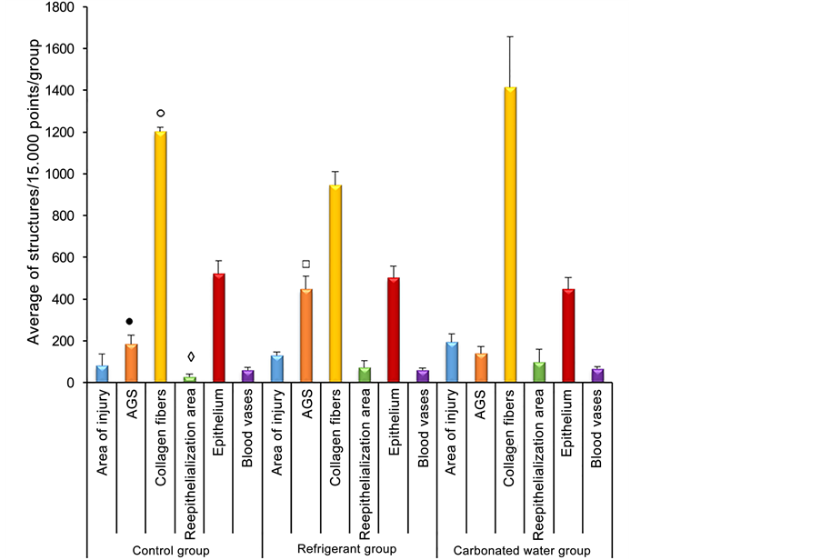 ◊ Significant difference between reepithelialization area of Control group x Carbonated water group (Analysis of significant variance (Q = 71.0 and p < 0.05));