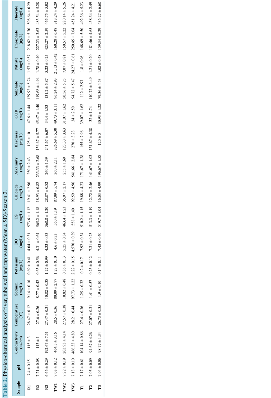 Table 2.Physico-chemical analysis of river,tube well and tap water(Mean±SD)-Season 2.