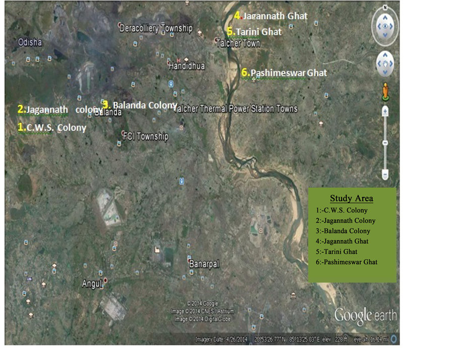 Sampling is the first essential step in accessing the quality of water. The present investigation is carried out during the Monsoon and Post Monsoon season of the year 2014. Water samples were collected in plastic bottles. After collection, the sample has been handled and preserved carefully to prevent any alternation in physical and chemical properties. Water samples were collected from three different sites of the river Brahmani, tube well and tap water of three different colonies. Before releasing of water to the locality area of Angul District, tap water was treated with Alum and Bleaching powder after passing through sand bed and Sabai grass. The three different sites of river Brahmani are Jagannath Ghat, Tarini Ghat and Pashimeswar Ghat and the three Colonies are C.W.S. Colony, Jagannath Colony and Balanda Colony (Figure 2). From 9 sites total 27 samples were collected for analysis and the mean values were considered.