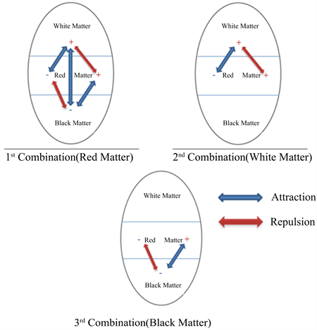 The first movement in the cycle starts from Red matter (which explains our assumption that Red matter is the “creative” energy, having the quality of activity). Red matter transfers to White matter, therefore making White matter positive. When Red matter transfers its negative charge to Black matter, and Black becomes negatively charged. Figure 2(b) shows this movement of electric charges.