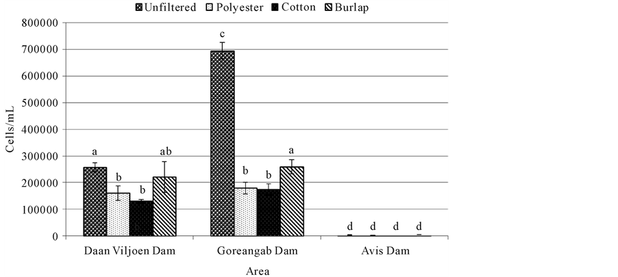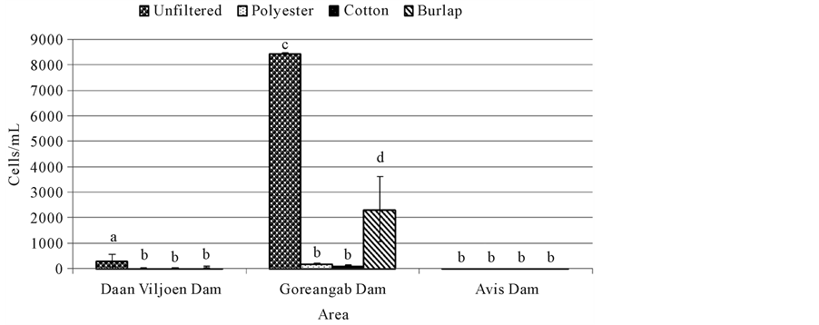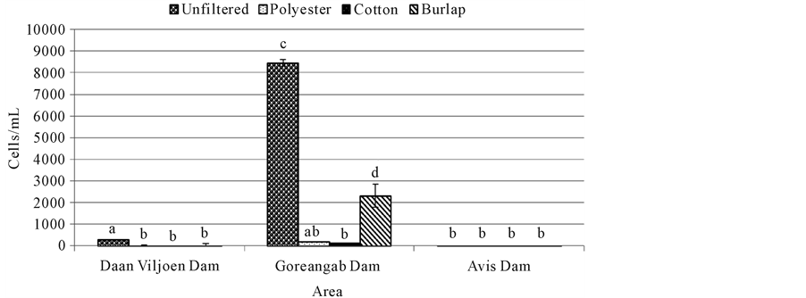 Heterotrophic plate count (HPC) was significantly high (p < 0.05) in unfiltered water (695,000 cells/mL) from Goreangab dam compared to water from Daan Viljoen dam (257,750 cells/mL) and Avis dam (3975 cells/mL) (Figure 2). HPC was significantly lower (p < 0.05) in water filtered with polyester and cotton in Daan Viljoen and a reduction in HPC was also observed with all filtration system in Goreangab dam (Figure 2). Furthermore, there was no difference (p > 0.05) in HPC between filtered and unfiltered water in Avis dam (Figure 2).