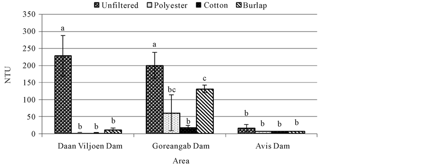 (200 NTU) but significantly lower (p < 0.05) after filtration with cotton, polyester, and burlap. It was observed that there was no significant difference between unfiltered water (200 NTU) and water filtered with burlap (131 NTU) from Goreagab dam (Figure 6). There was also no significant difference (p > 0.05) in turbidity between unfiltered water and water filtered with burlap, polyester and cotton in Avis dam (Figure 6).