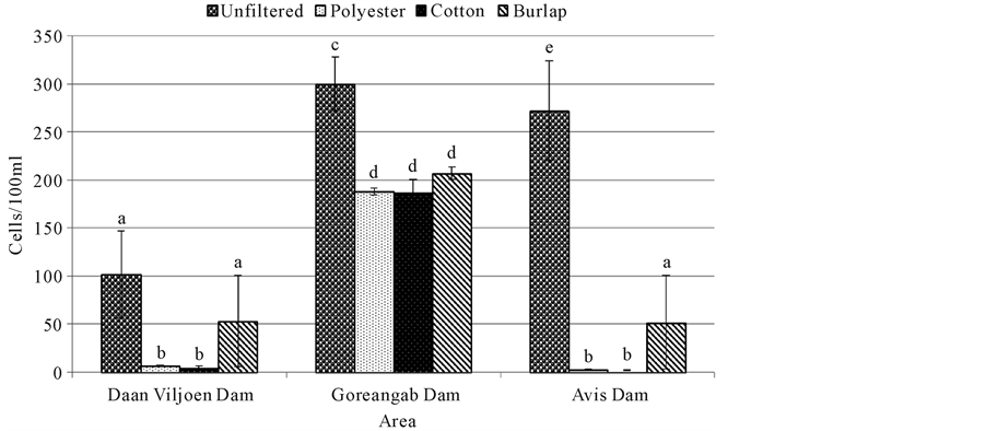 Clostridium perfringens was significantly lower (p > 0.05) in water filtered with cotton and polyester and significantly high in unfiltered water from Goreangab dam compared to unfiltered water from Daan Viljoen dam