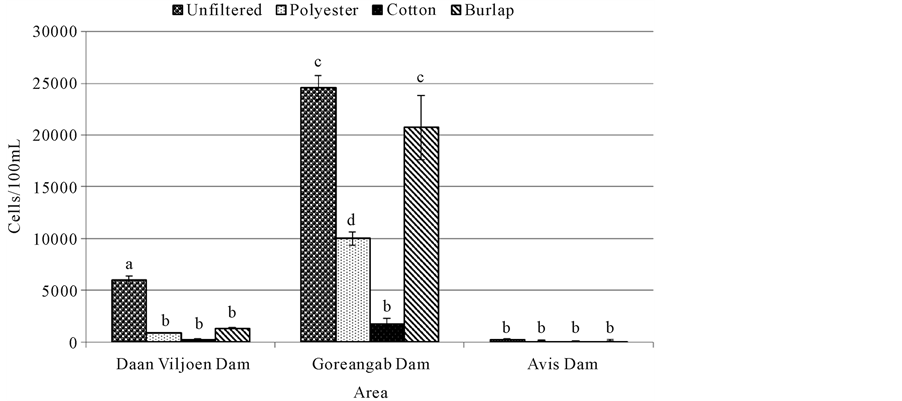 Total coliforms were significantly high in unfiltered water from Goreangab dam (845,000 cells/mL) but a significant reduction was observed after filtration. There was a significant difference (p < 0.05) between unfiltered water and water filtered with cotton, polyester and burlap from Daan Viljoen dam (Figure 4). There was no significant difference (p > 0.05) between unfiltered water and the filtered water from Avis dam (Figure 4).