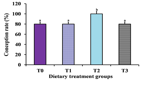 Figure 3. Effect of UMMC containing different levels of urea on conception rate of rabbit does (T0, UMMC containing 0% urea; T1, UMMC containing 4% urea; T2, UMMC containing 6% urea and T3, UMMC containing 8% urea). Each bar with error bar represents Mean ± SEM value. Differences were significant at 5% level of significance (P < 0.05).