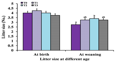 Figure 4. Effect of UMMC containing different levels of urea on litter size at birth and weaning of rabbit does (T0, UMMC containing 0% urea; T1, UMMC containing 4% urea; T2, UMMC containing 6% urea and T3, UMMC containing 8% urea). Each bar with error bar represents Mean ± SEM value. Differences were significant at 5% level of significance (P < 0.05).