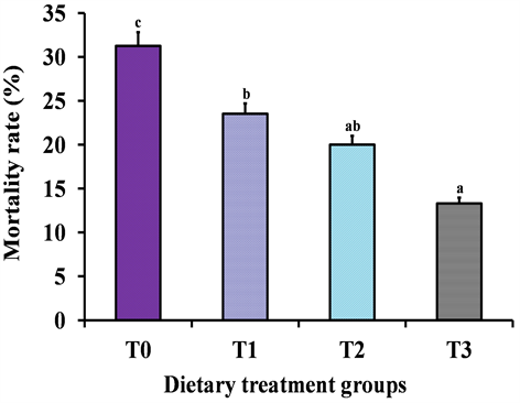 Figure 5. Effect of UMMC containing different levels of urea on mortality rate of kits of the does (T0, UMMC containing 0% urea; T1, UMMC containing 4% urea; T2, UMMC containing 6% urea and T3, UMMC containing 8% urea). Each bar with error bar represents Mean ± SEM value. Differences were significant at 1% level of significance (P < 0.05).