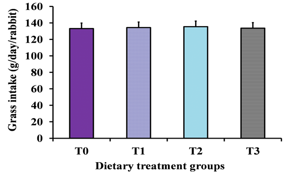 Figure 6. Effect of UMMC containing different levels of urea on grass intake of growing rabbits (T0, UMMC containing 0% urea; T1, UMMC containing 4% urea; T2, UMMC containing 6% urea and T3, UMMC containing 8% urea). Each bar with error bar represents Mean ± SEM value. Differences were not significant at 5% level of significance (P > 0.05).
