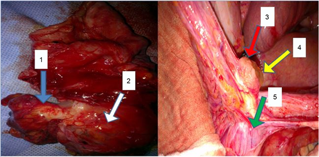 Figure 1. Preoperative images: 1―Posterior view of the appendix; 2―Posterior View of the caecum; 3―anterior view of the appendix; 4―Gelatinous collection attached to the tip of the appendix; 5―anterior view of the caecum.