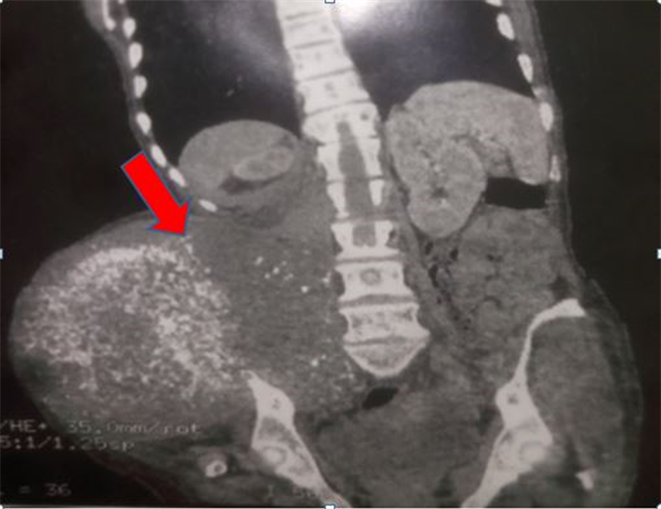 Figure 2. Image of tumor recurrence (the arrow shows the tumor recurrence with invasion of the right iliac bone and anterolateral abdominal wall).