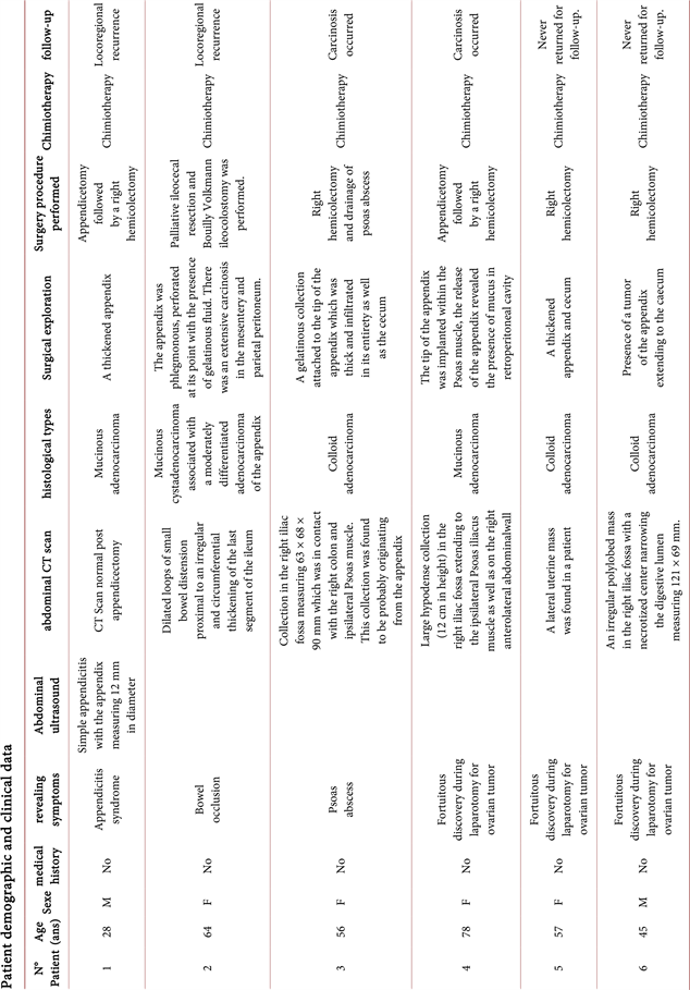 and infiltrated in its entirety as well as the cecum. Two patients had a thickened appendix and cecum; a deep thickened cecal pouch with an appendix in the internal lateral-cecal position. For the fourth patient, the tip of the appendix was implanted within the Psoas muscle, the release of the appendix revealed the presence of mucus in retroperitoneal cavity. The presence of a tumor of the appendix extending to the caecum was found in another patient. For the last one, the appendix was phlegmonous, perforated at its point with the presence of gelatinous fluid. There was an extensive carcinosis in the mesentery and parietal peritoneum.