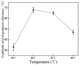 The effect of cultured pH on the degradation efficiency of Enterobacter sp. NO3 was shown in Figure 3(a). When the medium pH was 7.0, the degradation efficiency was the highest, and the effect of initial phthalic acid concentration on the degradation efficiency of Enterobacter sp. NO3 was shown in Figure 3(b). When the concentration of phthalic acid is 500 mg/L, the degradation efficiency is the highest, and the effect of temperature on the degradation efficiency of Enterobacter sp. NO3 is shown in Figure 3(c). When the temperature is 30˚C, the degradation efficiency of Enterobacter sp. NO3 is the highest. Under the conditions of pH 7, culture temperature 30˚C, initial concentration of phthalic acid 500 mg/L, inoculum = 1.2%, and shaking flask culture for 7 days, the maximum degradation rate of phthalic acid to phthalic acid by Enterobacter sp. NO3 can be detected to be 74%.