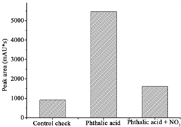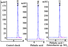 the condition of control, the peak area of the peak was 913487 and 3376 mAu*s, respectively (Figure 4), under the condition of phthalic acid and phthalic acid degrading bacteria, the degradation rate of phthalic acid in soil was determined by liquid chromatography. Enterobacter sp. NO3 can still be degraded in soil in situ.