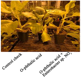 After transplanting tobacco seedlings, set experimental group 1 irrigated with 50 mL phthalic acid solution (2 g/L) and Enterobacter sp. NO3 bacterial solution 5 mL (0.3 × 109 CFU/mL), set experimental group 2 with 50 mL phthalic acid solution (2 g/L) and water 5 mL, and set control group with 55 mL water. The plant height, stem diameter, fresh weight and dry weight of rhizome and leaf were measured after cultured in constant temperature and humidity greenhouse for four weeks. Each group has 10 pots of tobacco seedlings and the experimental data were repeated 3 times and averaged.