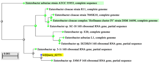 The DNA sequence of the 16S RNA region of the strain NO3 was obtained and the length of the product was 1466 bp. The blasted results in NCBI and the distance tree revealed that it was close to Enterobacter sp. 3-1t (EU543690.1) and Enterobacter sp. E4M-P (GQ478269.1). The homology was 99% (Figure 1), the microbe was therefore inferred to be Enterobacter sp., and the strain was named Enterobacter sp. NO3, deposited in GenBank (GenBank: MK128455.1).