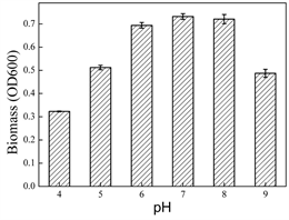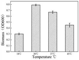 The growth of Enterobacter sp. NO3 was affected by different parameters and single factor experiments were designed. The single colony of Enterobacter sp. NO3 was inoculated in LB medium and cultured overnight. After collected by refrigerated centrifuge at 5000 rpm for 2 min, the bacteria were resuspended in inorganic salt medium, and the value of OD600 was adjusted to 1, which was used as seed. Seed was inoculated in 50 mL basic salt medium containing 500 mg/L phthalic acid (except phthalic acid concentration test), and different culture temperatures (18˚C, 30˚C, 37˚C, 45˚C), pH (4, 5, 6, 7, 8, 9) and inoculation concentration (0.4%, 0.8%, 1.2%, 1.6% and 2.0%) were set respectively. After those parameters were optimized, different concentration of phthalic acid (100 - 1000 mg/L) experiment were set. OD600 was measured at 48 h after culture while the effect of inoculation concentration on growth was measured every 8 h. The experimental data were repeated 3 times and averaged.
