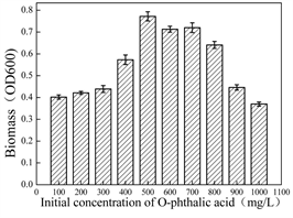 10 g silt was placed in the sterilizing triangle flask which contained 100 mL basic medium, and cultured in 30˚C of 180 r/min orbital incubator overnight. And then 10 mL suspension was added to the 90 mL BEPM medium for enrichment, and the domestication was done by gradient pressure culture method. The concentration of phthalic acid in enrichment medium was gradually increased from 100 mg/L to 700 mg/L. A solid BEPM medium containing 500 mg/L phthalic acid was used to isolate the tolerant bacteria by dilution and coating plate method. The colony with good growth, clear colony and distinct morphology was selected, and a single colony was isolated by plate marking method. The isolated colony was phthalic acid tolerant bacteria.