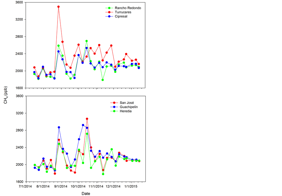 The CO2 and CH4 mixing ratios recorded at the Central Valley sampling sites are shown in Figure 3 and Figure 4, respectively, which compare sampling sites located inside the metropolitan area with those located outside the urban conglomerate. The seasonal cycle of near surface CO2 and CH4 is characterized by greater mixing ratios of both gases during the wet season than those recorded during the mid-summer drought and the transition period (Table 3). At these sites, the influence of wind direction on the pollutant transport pattern is located on the NE-SW axis across the valley. For the metropolitan area, and during the wet season, the average CO2 mixing ratio (629 ± 80 ppm) was 7% - 8% significantly higher than the corresponding average values recorded during the mid-summer drought and the transition period (p = 0.033 and 0.046, respectively). The average concentration outside the urban conglomerate (583 ± 32 ppm) during the wet season was 13% higher than in the mid-summer drought (p < 0.001), but not statistically significantly higher than in the transition period, which was only 2% higher (p = 0.334). Near surface CH4 followed a similar pattern, except for the sites located in the metropolitan area. In this area, the wet season average concentration (2192 ± 110 ppb) was 10% higher than the mixing ratio measured in July-August 2014 and 2% higher than the recorded values in November 2014-January 2015. However, both increases are not statistically significant (p = 0.137 and 0.798, respectively). Outside the more populated areas, the average concentration during the wet season was 2200 ± 145 ppb and was 12% significant higher than in the mid-summer drought (p = 0.033), but the observed increase of only 1% in the transition period is not statistically significant (p = 0.871). The increasing mixing ratios of both gases during the wet season might be related with the observed decrease in the average wind speed inside the valley (~1.5 m/s), which reduces the transport of pollutants in direction S-SW (see Table 2). However, it is apparent from Figure 3 and Figure 4 that the sampling sites located along the S-SW-W axis in the Central Valley, Guachipelín and Turrúcares, are influenced by the air masses transported from the heavy populated urban area, which increases the mixing ratios of both gases to concentrations as high as 750 - 900 ppm (CO2) and 3000 - 3500 ppb (CH4). A similar transport pattern has been reported in other urban areas, like Essen (Germany) and London, (England) where the wind direction controls the flow of pollutants in the surrounding areas [7] [17] .