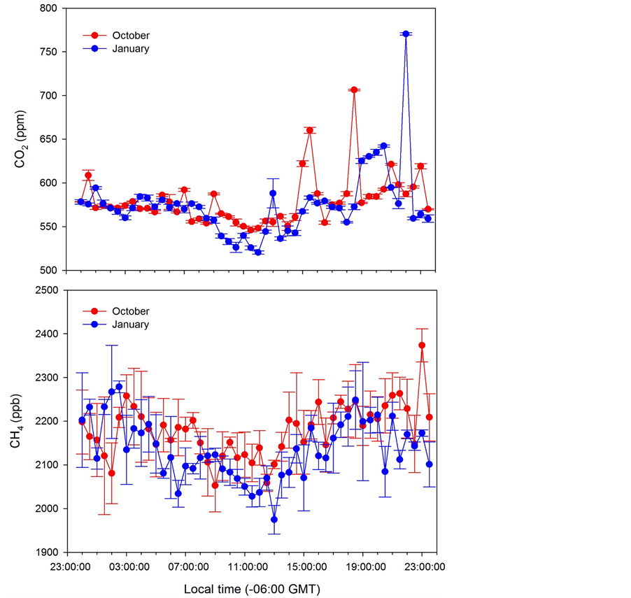 Figure 5. Diel patterns of carbon dioxide (top) and methane (bottom) recorded at the Heredia sampling site in October 2014 and January 2015.